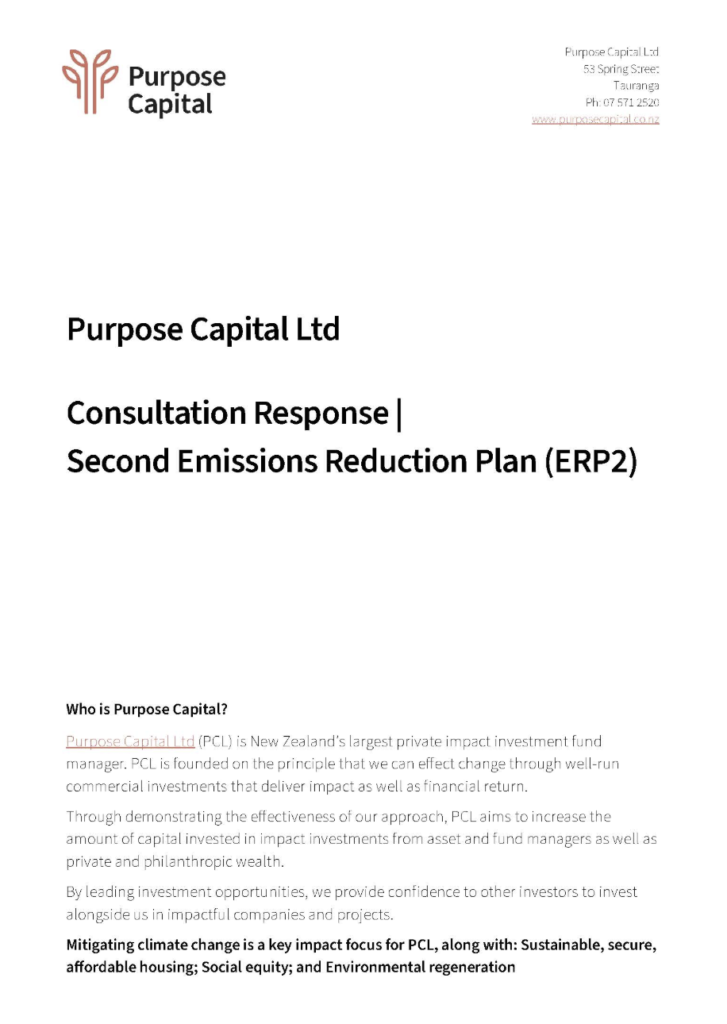 As Impact Investment Fund Managers, it’s important that Purpose Capital comments on the New Zealand Government’s Second Emissions Reduction Plan (ERP2), especially as related to scaling private investment in emissions reduction.